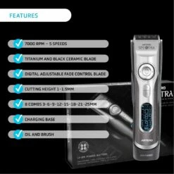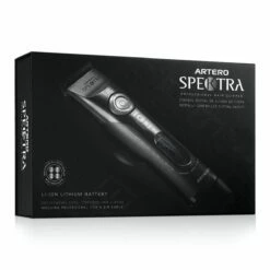 Artero® Spektra 5-speed Cordless Clipper features easy-to-read digital interface and 5-speed control for the ultimate ease of use. 4-in-1 sleek black ceramic blade, digitally adjusted cutting length control. Facilitates smooth fades. Use corded for all day trimming or cordless to reach tough spots with ease. Speed ranges between 5,000 to 7,000 rpm for versatile clipping. 4-hour Lithium-Ion battery life for extended grooming. Includes 4 guard comb attachments, lubricating oil, 4 in 1 blade, charging base, cleaning brush, battery, and electrical plug with adapter for all countries.