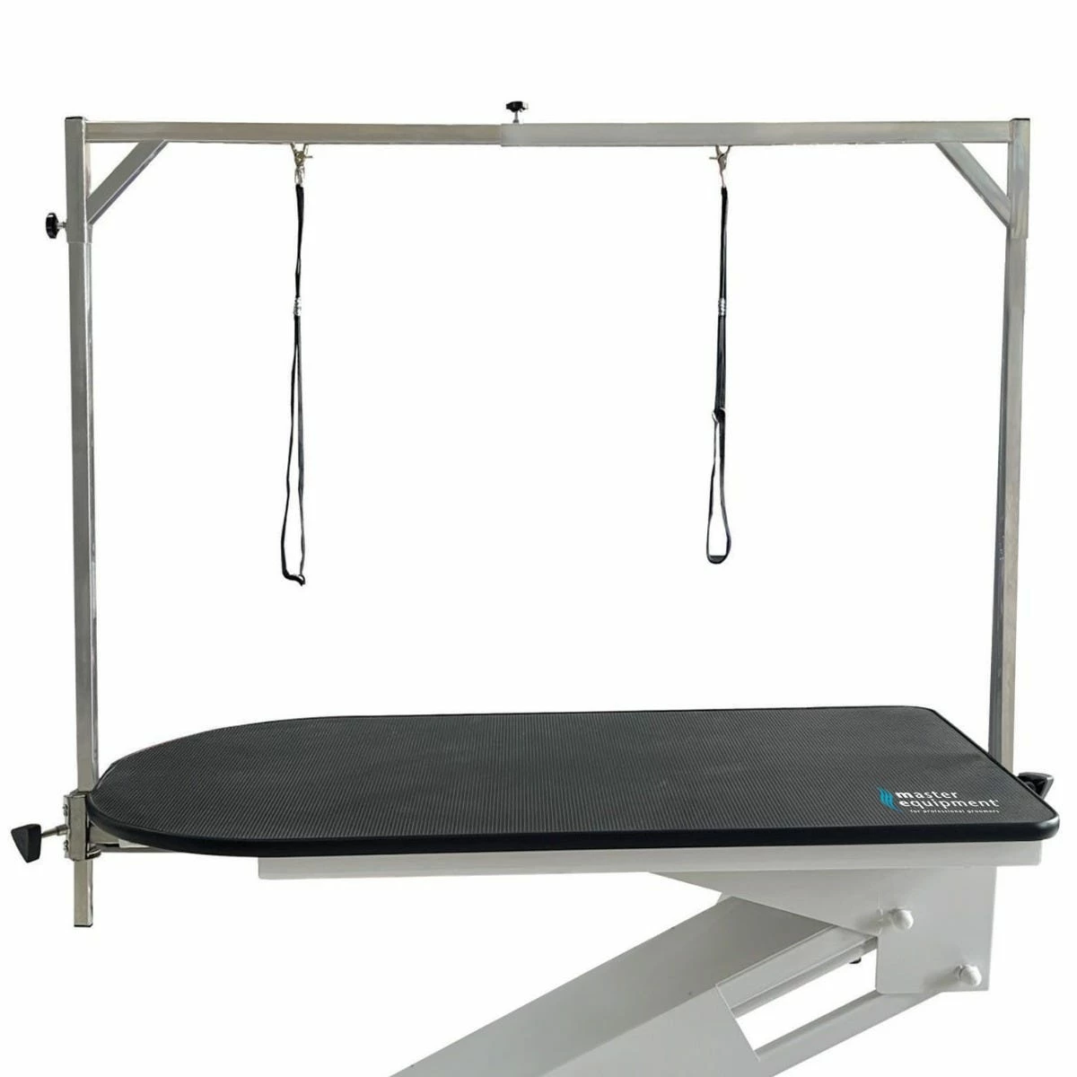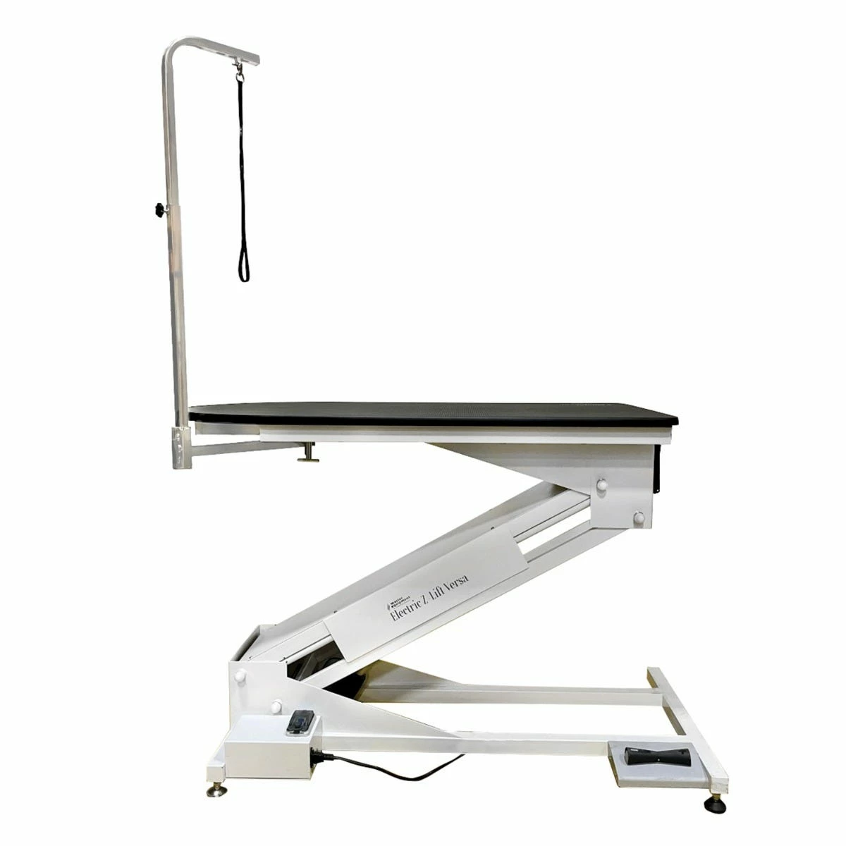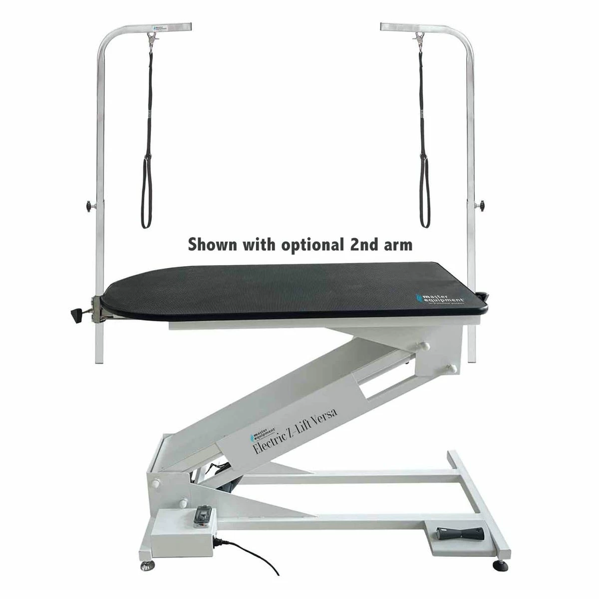 Overhead Arm Master Equipment Electric Z-Lift Versa Dog Grooming Table is a professional-duty versatile table designed for the professional groomer. Powerful lift capacity of 350 lbs means this table can handle even the largest dogs! Table top is 47”L x 23.5”W and is 1” thick. Table height is adjustable from 14.17″ to 42.5″ eliminating the need to pick up large dogs and is also great for small dogs too. With a versatile swivel arm that allows you to position the grooming arm out of the way when needed, table also has brackets for the included overhead grooming arm. The overhead arm allows you to use two grooming loops for more control over a hyperactive or uncooperative dog. It’s great for groomers who work by themselves and don’t have an extra set of hands around. Two USB outlets for charging and two electrical outlets for corded clippers and dryers keep the floors clear and safe around the table. Foot pedal control to raise and lower the table.