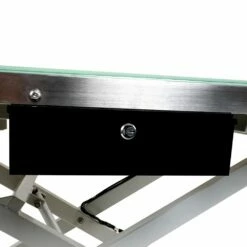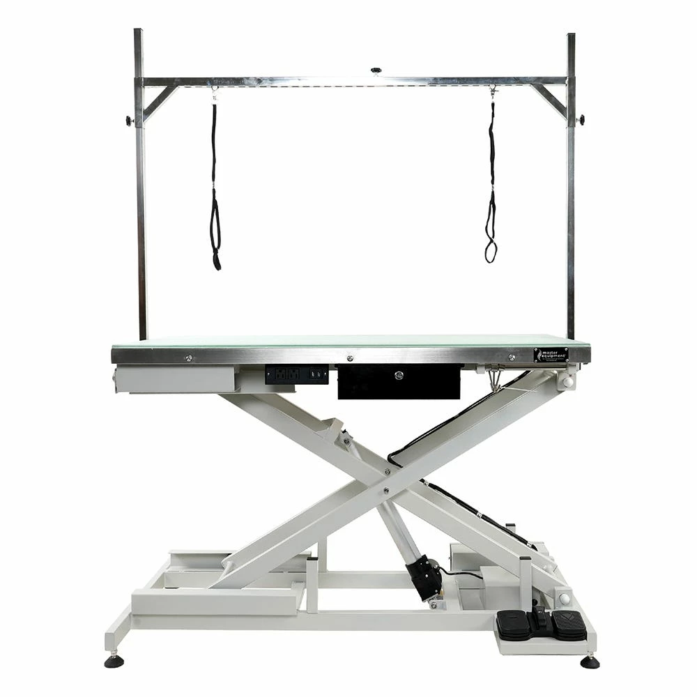 Shed some light on your grooming! The Master Equipment Radiance LED Lighted Electric Dog Grooming Table will brighten your grooming world. Dimmable, illuminated glass top lights the shadow areas of your grooming, making it easier to see your precise cuts and trims. High-class LED chip ensures over 12,000 hours of luminosity and does not get hot even after hours of continuous use. Table is particularly suitable for training, grooming and lecture demonstration, hospitals vets and salons. Lifting mechanism is always evenly supported by leveling feet to prevent wobbling and shaking. Versatile electric-lift table lifts up to 265 lbs and lowers to 10″ and raises to 37.5″. Includes a lockable drawer for your valuable tools, hooks for hanging tools, a USB outlet, and an overhead grooming arm with loop!