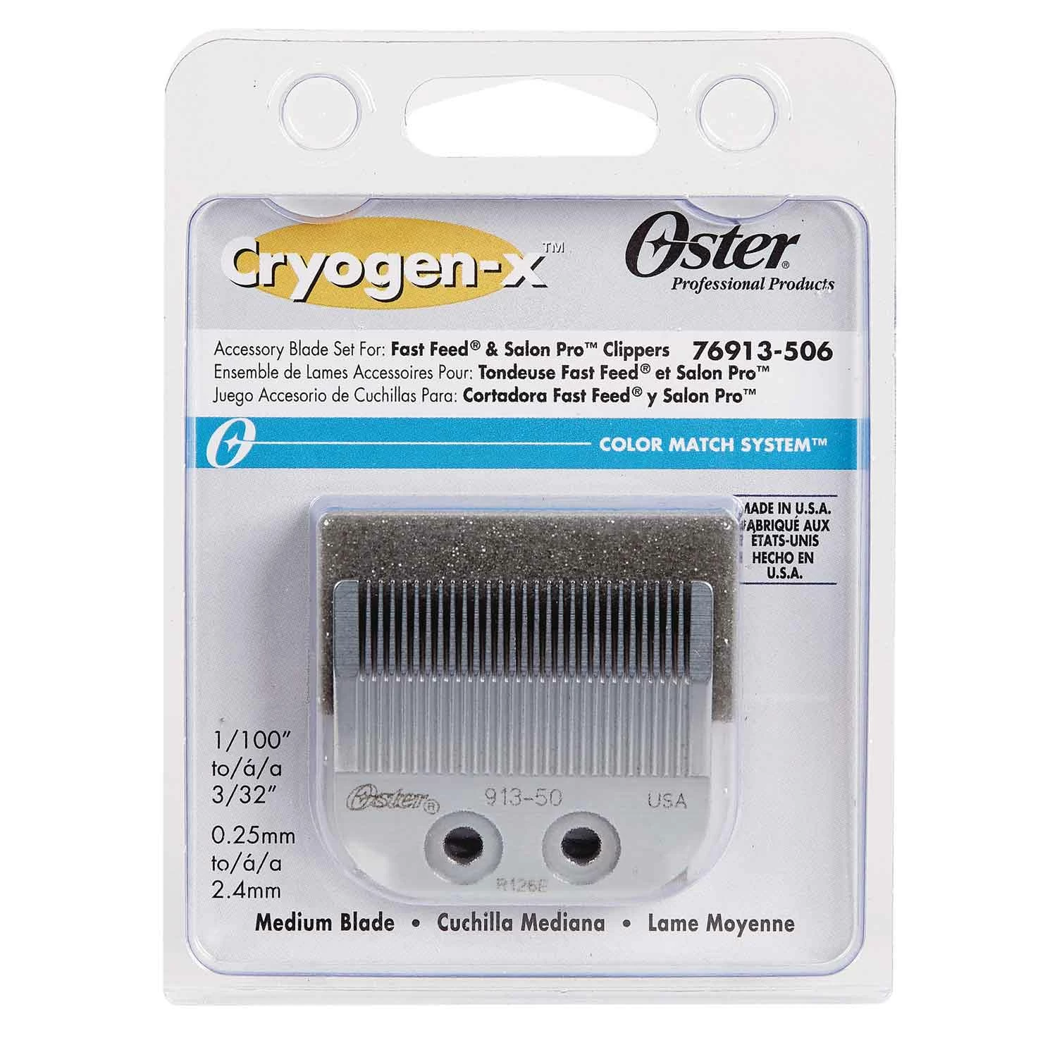 Designed for the Oster® Fast Feed adjustable clipper (OS3932 19), the Oster® Medium Blade for Adjustable Clippers provides unparalleled precision & performance. Made with Cryogen-x technology, finest high-carbon steel, and is ultra-sharp. Scratch and rust-resistant. Provides significantly longer wear life! Replacement Blade Set includes both top and cutter blade, and adjusts from 1/100″ to 3/32″ (0.25mm to 2.4mm). Designed to cut very close to medium length. Rockwell hardness RC62-68. Made in USA.