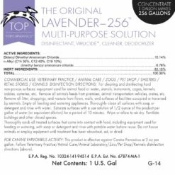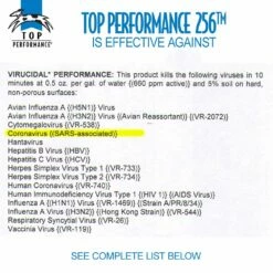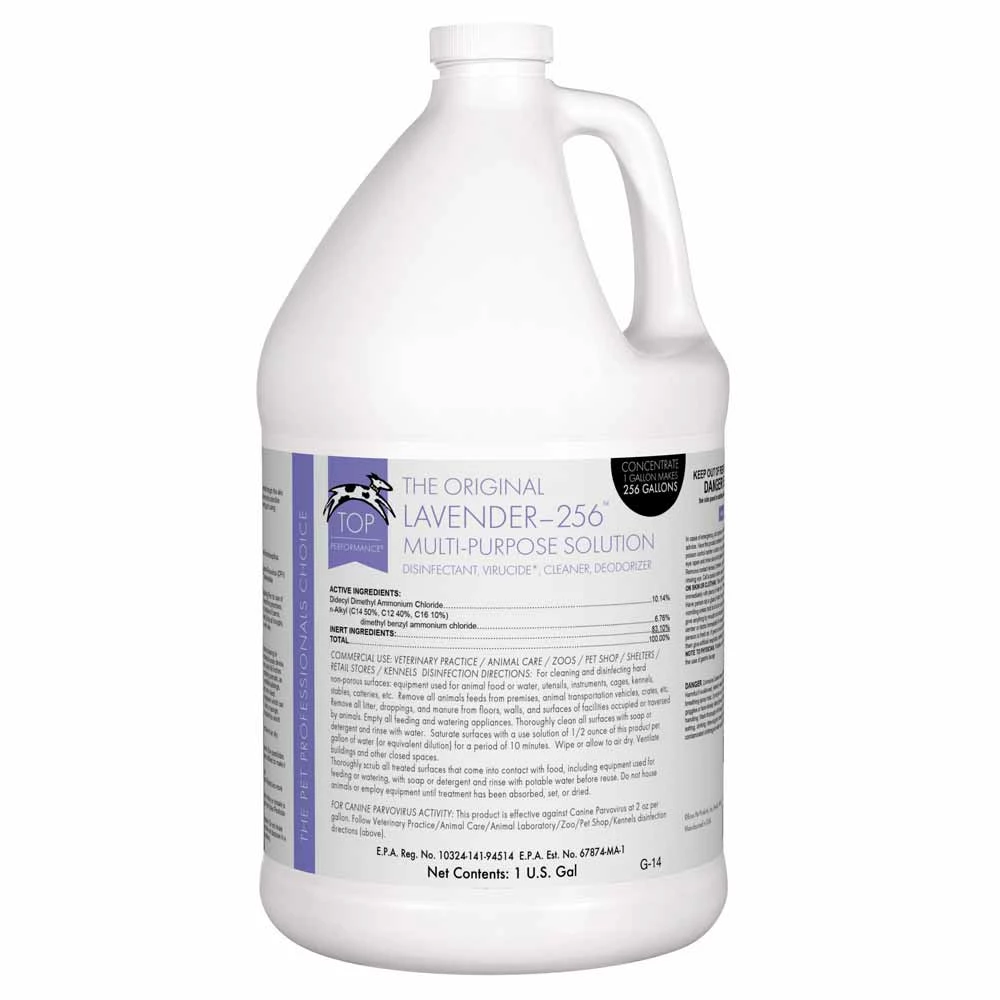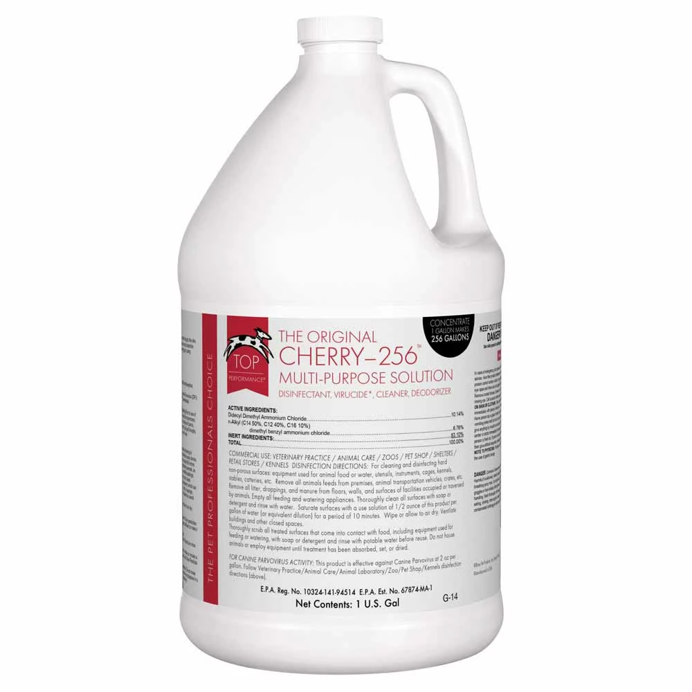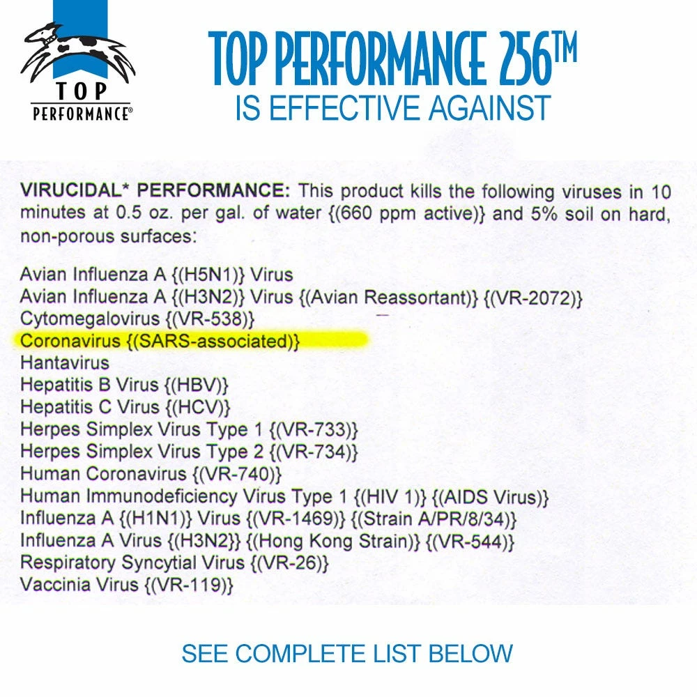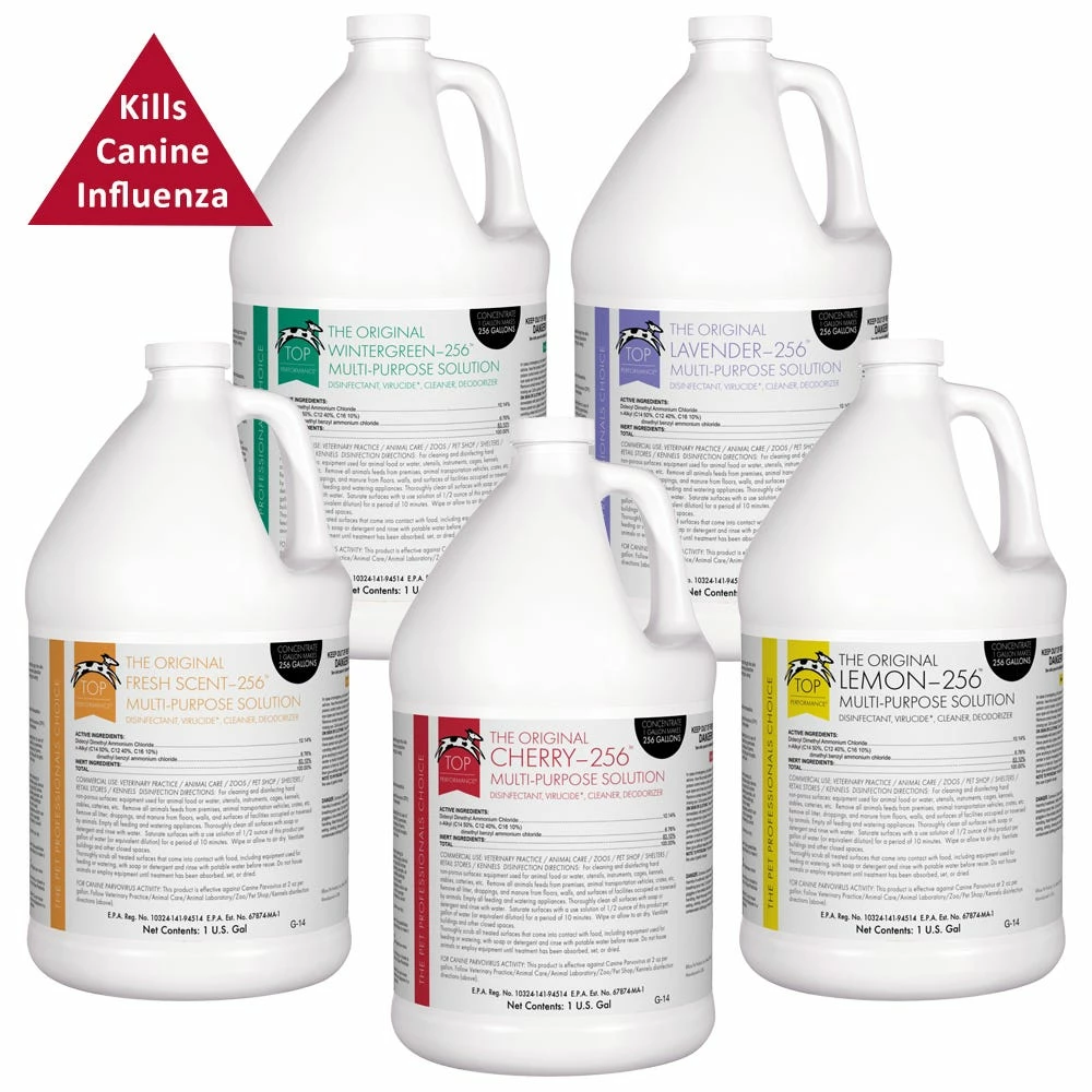 The Original 256 -Top Performance® 256 Disinfectant, Detergent, and Deodorant is a powerful, concentrated, multi-purpose disinfectant and deodorizer. Provides area control of staph, salmonella, E. coli, bordetella bronchiseptica, adenovirus, canine distemper, feline picornavirus, HIV-1, infectious bovine rhinotracheitis, rabies, herpes, pseudorabies, respiratory syncytia, streptococcus — even canine influenza and canine parvovirus. Kills canine influenza, plus over 50 other viruses and pathogens!